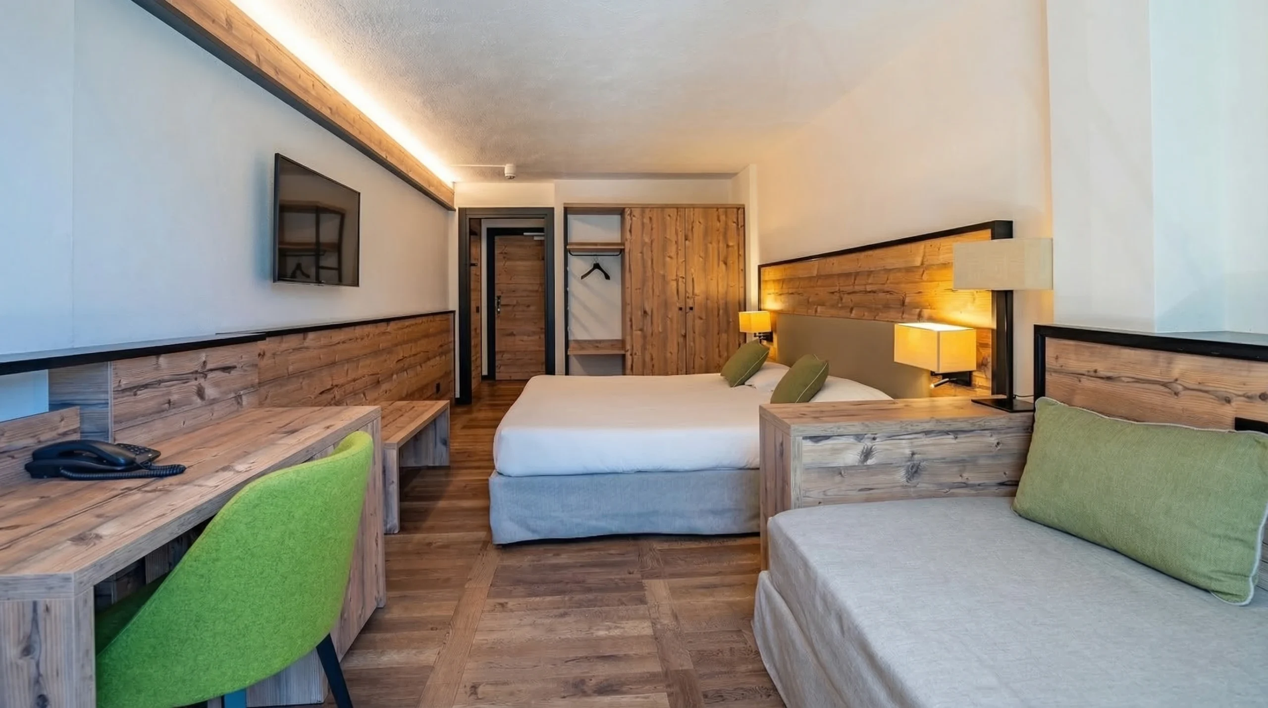 Accanto all’adeguamento tecnologico ed energetico, il progetto ha incluso la completa riqualificazione delle camere e degli spazi comuni, con l’obiettivo di restituire un ambiente ricettivo più contemporaneo, efficiente e coerente con le esigenze dell’ospitalità attuale.